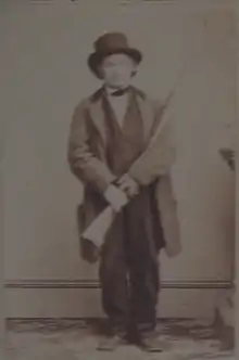 His somewhat peculiar dress consisted of dark trousers and a waistcoat, a blue "swallow tail" coat with burnished brass buttons, such as used to be affected by well-to-do gentlemen of the old school about 40 years ago, and a high black silk hat, from which most of the original gloss had long departed, of a shape to be found only in the fashion plates of the remote past.[5]
