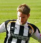 On 29 May 2008, McCombe agreed a two-year contract to join Port Vale.[14] He claimed one of the reasons he put pen to paper was that having met manager Lee Sinnott 13 years previously, he knew that Sinnott could help improve his game.[15] However, he established himself as a first-choice centre back under new manager Dean Glover, but was also told he was too 'nice' and needed to be more aggressive in his defending.[16] Nevertheless, his performances 2008–09 earned him the chairman's Player of the Year award,[17] as well as the nickname 'Boom Boom McCombe' from fans.[18]