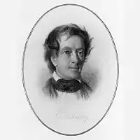 Although admitted to the bar in 1816, he was much more interested in literature and politics than law. He associated with the focal point of Baltimore's literary community, the Delphian Club.[8] Kennedy's first literary attempt was a fortnightly periodical called the Red Book, published anonymously with his roommate Peter Hoffman Cruse from 1819 to 1820.[9] Kennedy published Swallow Barn, or A Sojourn in the Old Dominion in 1832, which would become his best-known work.[10] Horse-Shoe Robinson was published in 1835 to win a permanent place of respect in the history of American fiction.