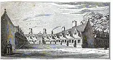 Port had no surviving sons when he died on 6 June 1557. By his will he left bequests for the creation of an almshouse at Etwall and a "Grammar School in Etwalle or Reptone", where the scholars every day were to pray for the souls of his parents and other relatives. The executors purchased land which had once been the grounds of the Augustinian Repton Priory.[5] The priory had been dissolved in 1538, however the buildings remained standing until 1553 when the then owner, Gilbert Thacker, fearing the priory would be recommissioned under the Roman Catholic Queen Mary I, had the church completely destroyed; a task that was almost entirely completed within a single day.[6][7] Gilbert Thacker claimed "He would destroy the nest, for fear the birds should build therein again."[6] Thus only a few fragments and foundations of the original priory church remain, although other buildings survived and are now part of Repton School.[8][9] Port also confirmed and augmented his father's grants to Brasenose College, Oxford.[2]