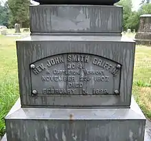 In 1839, Griffin was married in Saint Louis, Missouri, to Desiré C. Smith, who would die in 1884. He then married Lina Harvey Kenyon in Three Oaks, Michigan.[1] Griffin's sister-in-law Rachel Jane Smith married fellow missionary Henry H. Spalding as Spalding's second wife.[5] John Smith Griffin died on February 5, 1899 and is buried at Hillsboro Pioneer Cemetery in Hillsboro, Oregon.[6]