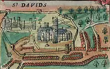 By 1595, Speed published a map of biblical Canaan, in 1598 he presented his maps to Queen Elizabeth, and in 1611–1612 he published maps of Great Britain, with his son perhaps assisting Speed in surveys of English towns.[17][18][19]