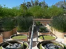 The first "Living Machine" was created at Findhorn Ecovillage in Moray, Scotland in 1995.[3] For its design, John Todd drew on the work of Käthe Seidel and H.T. Odum.[3] The system had to accommodate wastewater from an ongoing population of about 300 residents, and a seasonally fluctuating population of as many as 10,000 visitors per year.[19] The resulting installation resembles a tropical conservatory garden. Every organism provides food for the next step in the food chain until the cycle is complete.[3]