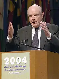 John William Snow (born August 2, 1939) is an American economist, attorney, and businessman who is the former CEO of CSX Corporation and served as the 73rd United States secretary of the treasury under U.S. President George W. Bush. He replaced Secretary Paul H. O'Neill on February 3, 2003 and was succeeded by Henry Paulson on July 3, 2006.[1][2][3] Snow submitted a letter of resignation on May 30, 2006, effective "after an orderly transition period for my successor."[4] Snow announced on June 29, 2006 that he had completed his last day on the job; Robert M. Kimmitt served as acting secretary until Paulson was sworn in. Snow has since worked as chairman of Cerberus Capital Management.[5]