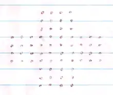 For the "touching" version of the game with lines consisting of 5 marked points, the present record of 178 lines was established on 2011 August 12, using a Monte-Carlo search by algorithmist Christopher Rosin.[5][6] This is eight moves more than the previous 1976 record of 170 lines.[3][5][7] The 1976 record was done by hand, and computer searches had not been able to approach this record[7] despite substantial progress,[8] until August 2010 when Christopher Rosin used a Monte-Carlo search to obtain a result of 172 moves, exceeding the 1976 record, and 178 moves one year later.[6]