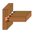 The end of a piece of wood is laid over and connected to another piece of wood. Due to a large surface area of long-grain to long-grain wood and glue surface coverage, this is a very strong joint.[2] |