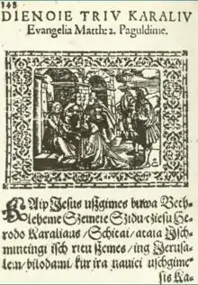 After living twenty-five meager years in Labiau, Bretke (Jonas Bretkūnas) applied for a position as pastor at another Prussian town, but was in 1587 transferred to a Lithuanian language parish in Königsberg as pastor.[2] He continued with his translation of the Bible and other scholarly works. In 1589, he published several new works, in particular "Giesmes duchaunos" (Spiritual Hymns), based on Martynas Mažvydas' works, as well as a small collection of hymns called "Kancionalas netukriu giesmiu", and a prayer book translation from German into Lithuanian "Kollectas", all printed by Georg Osterberg of Königsberg.