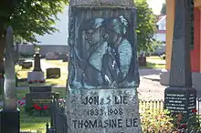 In 1860, he married his cousin Thomasine Henriette Lie (1833–1907). The couple had five children, of whom two died young. They were the parents of diplomat Michael Strøm Lie (1862–1934) as well as writers Mons Lie (1864–1931) and Erik Røring Møinichen Lie (1869–1943). Jonas Lie died at Fleskum at Sandvika during 1908, less than a year after the death of Thomasine.[11][12]
