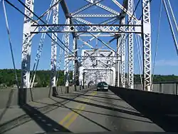 Construction of a 1600-foot-long steel multi-girder replacement bridge just upstream of the original bridge began in September 2013.[6][7][8][9][10] The new bridge, which opened to traffic on October 20, 2015,[11][12][13][14] has four 11-foot-wide traffic lanes (2 in each direction), one 4-foot-wide median, one 4-foot-wide shoulder on each side of the roadway, and a 5-foot-wide ADA-compliant sidewalk on the bridge's southern side.[14][15] The old bridge was demolished on January 26, 2016.[16]