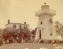 The history of this station is somewhat confusing, but it appears that a light station was first established on Jordan Point in 1855. This consisted of a keeper's house with a masthead light on the roof. This arrangement was replaced circa 1875 (possibly as early as 1870) by a separate 35-foot (11 m) pyramidal wooden tower that housed a sixth order Fresnel lens and a fog bell. A new keeper's house was constructed in 1888.[1]