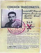 As head of Catalan requeté Cunill embarked on major shake-up of the paramilitary, carried out in line with general re-organisation enforced centrally. Already in 1933 representatives of the Catalan branch took part in national rally in the Cantabrian Potes;[40] throughout 1934 Cunill implemented new hierarchical structure and command chain, introduced strict discipline, issued ID cards and commenced regular tactical drills in the countryside. In 1934 some 15 Catalan requetés attended a training in Fascist Italy.[41] Cunill was eager to maintain some separate identity of the Catalan branch, be it in terms of organisation or uniforms, though this did not lead to major problems.[42] His role in buildup of the Catalan requeté is compared to this of Antonio Lizarza in Navarre.[43]