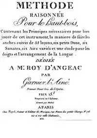 From 1792, he taught oboe at the National Guard where he became friends with the violinist Rodolphe Kreutzer, who dedicated his oboe concerto to Garnier and with whom Garnier gave the concerto's first performance. Garnier joined the National Conservatory of Music (founded by the Convention) in 1795, where he was one of five professors of oboe (along with Bernard Delcambre, Gebauer, François Félix-Miolan and François Sallantin.[2] Garnier was dominant at the Conservatoire; he was "the savior of the French school of oboe during the Revolution."[3]