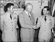 ![]() McConnell with his F-86, Beauteous Butch II, following his last mission in Korea | |