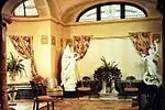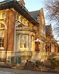 The Bettendorf house is considered a well-preserved example of the English Manor Style, and it was once described as "the finest mansion ever built in the Quad-Cities."[4] The north elevation is considered the public facade as that is where the main entrance is located, but the south elevation is more ornate. When it was built it contained marble fireplaces, marble and hardwood floors, ornate ceilings, paneling made from different woods, crystal chandeliers, and lead glass windows. There is a glass-covered marquee above the front entrance on the north side of the home. A grand staircase on the south side of the house leads through a terraced, landscaped garden, and is flanked by statues of guard dogs. The entire third floor was a ballroom. The basement held a card room, gymnasium, billiard room, and two bowling allies. The residence remained intact with its original furnishings into the 1940s.[4] Renovations in 1966 and 1973 increased the number of bathrooms, the library was converted into a chapel, and the bowling alley and the pool were eliminated. Later, the ballroom was converted into a library. The two-story brick carriage house, which was built at the same time as the main house, remains in its original location.