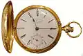 He was a nonconformist who was married to Mary Bryers[3][4] and who worked in Liverpool from 1795 to about 1827. The earliest specific date (from the hallmark in the silver case) known for a watch of his is 1811.[5] He is known to have worked from a factory at 25 Church Street, although census records indicate that his residence was elsewhere in the same street (No. 26 and later (1841 census) No. 49); only No. 25 is named on the movements of his watches.[6] After his death, on 2 March 1827, his wife Mary, son Joseph Johnson and grandsons Joseph Johnson Cashen and Joseph Johnson Norris continued his work until at least 1857.[7] His watches are of high quality and were usually provided with precious metal cases, often in gold; these have often been lost in the course of time, so that many Johnson watches now survive only as uncased movements. Joseph Johnson had a preference for using fully jewelled watch movements.[6] He is credited with inventing several design improvements to the pocket watch and watch movement. His watches were commonly used on U.S. railroads, before the establishment of the U.S. watch industry. In 1816 the United States government chose a chronometer signed by Johnson, No. 508, for a presentation to Commodore Oliver H. Perry in recognition of his action against the British on Lake Erie.