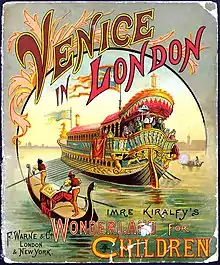 Between 1891 and 1893 they staged Venice in London at Olympia[6] which combined catering by Lyons, entertainments and opportunities to purchase souvenirs with a stage show designed and directed by the theatrical impresario Imre Kiralfy who specialised in spectacular events and lent his name to the production to increase its appeal to the public.[7] It required the import of 100 gondolas from Venice with Venetian gondoliers.[8] According to The Times, 4,893,980 people visited the event in its first year with 24,737 visiting on Boxing Day 1892.[9]