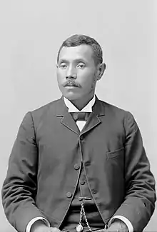 In the election of 1892 Nāwahī changed party alliance and ran as a candidate for the newly created National Liberal Party, defeating Reform candidate Robert Rycroft for the seat of South Hilo in the House of Representatives.[32] The Liberal Party advocated for a constitutional convention to draft a replacement to the unpopular Bayonet Constitution and increased Native Hawaiian participation in the government. The party was divided between radicals and more conciliatory groups. Nāwahī and William Pūnohu White (the representative of Lahaina) soon became the leaders of the factions of the Liberals loyal to the queen against the more radical members including John E. Bush and Robert William Wilcox, who were advocating for drastic changes such as increased power for the people and a republican form of government.[33] Nāwahī was initially elected vice-president under Bush and later became the president of the Liberal Party.[34][35]