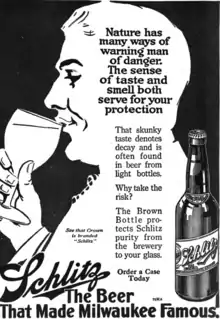 The Joseph Schlitz Brewing Company was an American brewery based in Milwaukee, Wisconsin, and once the largest producers of beer in the United States. Its namesake beer, Schlitz ( /ˈʃlɪts/), was known as "The beer that made Milwaukee famous" and was advertised with the slogan "When you're out of Schlitz, you're out of beer".[1] Schlitz first became the largest beer producer in the US in 1902 and enjoyed that status at several points during the first half of the 20th century, exchanging the title with Anheuser-Busch multiple times during the 1950s.[2]