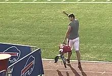 During a Week 3 matchup against the Minnesota Vikings, Allen led the Bills to their first victory of the season with a dominant first-half performance. Allen passed for 196 yards and a touchdown, adding 39 yards on the ground with two rushing touchdowns in a 27–6 victory.[38] In particular, he hurdled over Vikings linebacker Anthony Barr on one of his scrambles to pick up a first down, a play that went viral on social media.[39][40]