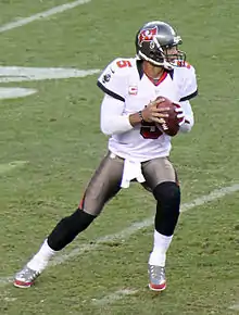 Freeman was selected by the Tampa Bay Buccaneers in the first round (17th overall) of the 2009 NFL Draft.[14] He entered the draft with one year of college eligibility left.[15] The Buccaneers later agreed to terms with Freeman on a five-year, $26 million contract, with another possible $10 million in incentives and bonuses.[16] On November 8, 2009, Freeman started his first professional game at home against the Green Bay Packers. The Buccaneers won by a score of 38–28, ending an 11-game losing streak. He completed 14 out of 31 passes for 205 yards, three passing touchdowns, and one interception, including a fourth down touchdown pass to rookie Sammie Stroughter to take the lead, 31–28 late in the game.[17] Freeman became the youngest quarterback in franchise history to start and win his first game. On December 27, 2009, he led the Buccaneers to a 20–17 overtime win over the 13–1 New Orleans Saints, preventing them from clinching the top seed in the playoffs for one more week.[18] The Buccaneers finished the 2009 season with a 3–13 record as Freeman finished with 1,855 passing yards, ten touchdowns, and 18 interceptions.[19]
