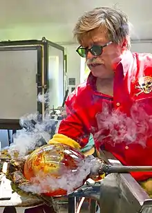 Simpson's career began in 1972, when he was a senior at Hamilton College. At the time, seniors were permitted to pursue their own interests during the month of January, so he spent that period practicing glass blowing in Vermont. Simpson became so enamored of working with glass that a month became a year, and while he did return to Hamilton briefly to complete his psychology degree, he has been pursuing this passion ever since.[2] He is particularly well known for his planets, glass paperweights ranging in size from about an inch in diameter to the 107-pound Megaplanet the Corning Museum of Glass commissioned in 2005.[3] He originally began making planets in the mid-1970s, when he was trying to capture the interest of eighth-graders during glass blowing demonstrations. Inspired by the story of the Apollo astronauts seeing the earth hanging in space like a blue marble, he began creating marble-sized planets for the students.[2] This early inspiration developed into a major artistic direction. In addition to exhibiting and selling these works, Simpson also hides them in various settings across the globe, and even offers the public the opportunity to participate through his Infinity Project.[4] Other significant portions of Simpson's body of work are formed from materials he refers to as "New Mexico glass" and "Tektite glass". The vibrant blue color of New Mexico glass evokes the night sky in summer, and is also an attempt to duplicate the color of Cherenkov radiation, which Simpson saw while touring nuclear power plants. The Tektite glass is based on a spectrographic analysis Simpson had performed on a natural tektite. He recreated this material in his furnace, discovering in the process that it is very difficult to work. While he uses the New Mexico glass to create elegant platters, bowls, and vases, the greyish-black Tektite glass often resembles lava, seeming to have taken its shape without human intervention.[2]