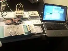 While at the University of Chicago Zayner created a musical instrument, the Chromochord, which stimulates light-, oxygen-, and voltage-sensing proteins and translates their reactions into music.[26][27] Together with composer Francisco Castillo Trigueros he received a grant from the university to compose music and create audio visual art installations using the work.[28] Zayner, gave a musical performance using the Chromochord at NY MoMA PS1.[29]