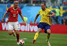 In qualification for the 2018 World Cup, Drmić scored once, the sole goal of a victory over Latvia at the Stade de Genève on 25 March 2017. It was his first goal in any match since February 2016, heading an Admir Mehmedi cross two minutes after coming on in place of Gelson Fernandes.[43] Manager Vladimir Petković named him for the squad to compete in the finals in Russia.[44] In the final group game against Costa Rica in Nizhny Novgorod, he came on as a late substitute for Mario Gavranović and scored in a 2–2 draw that ensured passage to the last 16.[45]