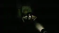 The Wii Remote is used to direct the player character's flashlight; however, rather than using the controller's infrared functionality, the games uses the Wii remote's accelerometer to guide the onscreen tool.[2] Movement is executed by the Wii Remote's control pad and B Button, and the character is steered in the direction their flashlight is being held.[2] The player is pressured not to remain in the same place for too long or move too slowly, as this will cause Kayako, the onryō to appear to the player.[3] If there is a second Wii Remote synced to the console in the game's "courage test", each of the buttons on that controller can be used to trigger a unique scenario for the player to experience.[1][2] The game also features a mechanic that measures the Wii Remote's movements during gameplay, so that the more the player flinches, the worse their success rate becomes.[4]