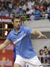 Juan Carlos Ferrero Donat (Spanish pronunciation: [xwaŋ ˈkaɾlos feˈreɾo ðoˈnat];[lower-alpha 1] born 12 February 1980) is a Spanish former world No. 1 tennis player. He won the men's singles title at the 2003 French Open, and in September of that year became the 21st player to hold the top ranking - for eight weeks. He was runner-up at the 2002 French Open and 2003 US Open. He was nicknamed "Mosquito" for his speed and slender physical build. Ferrero retired from professional tennis following the 2012 Valencia Open,[1] returning for a brief doubles stint in 2017.