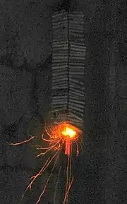 The belt can be laid out on the ground or suspended from something like a tree or wall. The end of the fuse is lit, and as the fuse burns, it ignites each of the explosives with a noise similar to a machine gun.[4]
