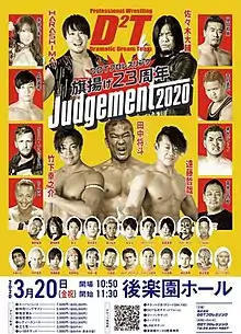 Judgement 2020: DDT 23rd Anniversary (Judgement2020〜DDT旗揚げ23周年記念大会〜, Judgement 2020: DDT hataage 23 shūnen kinen taikai) was a professional wrestling event promoted by DDT Pro-Wrestling (DDT). It took place on March 20, 2020, in Tokyo, Japan, at the Korakuen Hall with a record low attendance of 916 people due in part to the ongoing COVID-19 pandemic at the time.[2][1] It was the twenty-fourth event under the Judgement name. The event aired domestically on Fighting TV Samurai and globally on DDT's video-on-demand service DDT Universe.