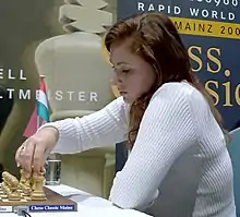 By early 2003, Polgár had worked her way back into the top 10 rated players in the world.[151][152] In 2003, Polgár scored one of her best results: an undefeated clear second place in the Category XIX Corus chess tournament in Wijk aan Zee, Netherlands, just a half-point behind future World Champion Viswanathan Anand and a full point ahead of then-world champion Vladimir Kramnik. One of the highlight games of the tournament was Polgár's fourth round crushing victory over Anatoly Karpov. She played a novelty in the opening which she devised over the board. The game lasted 33 moves with Karpov down two pawns and his king exposed. Polgár admitted to "enjoying herself" by the end of the game.[153] In April 2003, Polgár finished second in The Hunguest Hotels Super Tournament in Budapest behind Nigel Short. She appeared headed for a first-place victory in the tournament, but lost her game against compatriot Péter Lékó.[154][155][156] In June 2003, Polgár finished tied for third with Boris Gelfand, in the Enghien-les-Bains International Tournament in France, scoring 5½–3½, behind Evgeny Bareev who won the tournament and GM Michael Adams.[157] In August 2003, Polgár played an eight-game rapid chess match in Mainz, Germany against Viswanathan Anand, billed as the "Battle of the Sexes". After six games each player had won three games. Anand won the final two games to win the match.[158][159] In October 2003, Polgár won the 4–grandmaster Essent tournament in Hoogeveen, Netherlands. In one of her games against Karpov, he blundered, allowing Polgár to utilize a famous double bishop sacrifice first employed by Emanuel Lasker against Bauer in 1889.[160][161][162][163]