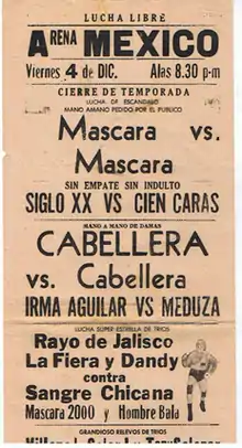 | 5 | Cien Caras defeated Siglo XX | Best two-out-of-three falls Lucha de Apuestas, mask vs. mask match[7] |