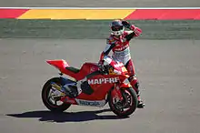 In 2009 he signed with the Mapfre Aspar team to compete in the 125 class. He famously celebrated winning a race a lap before the race finished, allowing himself to be overtaken. He eventually finished fourth.[1] He was dominant at the subsequent Sachsenring race, dominating both wet qualifying and the dry race. This set the tone for a dominant season in which he clinched the title by overtaking closest rival Bradley Smith on the final lap at Phillip Island. He then also beat Smith to win the final two races of the year.