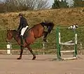 During the first stride after the jump, the horse re-balances itself.[1] Horses sometimes react to discomfort or high emotion during the recovery, and may buck, bolt, or toss their heads.