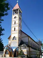The Our Lady of las Nieves church is located at the town center. It is dedicated to the Chilean-born Blessed Laura Vicuña, who lived in Junín de los Andes in 1904. The building contains Gothic architecture elements, such as a rib vault and is adorned by Mapuche looms on the walls. The altar is held on four rocks from the Huechulafquen lake, representing religious believes from all cultures.[23]