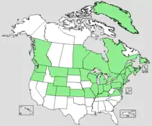 Juncus gerardii is mainly a coastal species, occurring at the high tide mark on the Mediterranean, Atlantic, Baltic and Black sea shorelines of Europe and the east coast of North America [1] Juncus gerardii is one of the many species identified by Eric Hultén as amphi-Atlantic plants, meaning that they have a disjunct distribution on both sides of the Atlantic, but are absent on the Pacific side of the globe.[2]:172 It also occurs inland in parts of eastern Europe, west and central Asia, particularly on saline soils. In North America it occurs along the shorelines of areas once flooded by the sea, and as a weed along railway lines, for example in Minnesota.[2] In Indiana, it is the only Juncus species found in the Tipton Till Plain, a Till Plain in the Glacial till plains.[3]