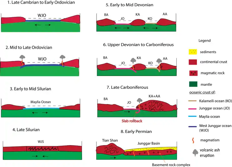 Xinjiang paleocraton was pulled apart for a continental rifting episode to form extensional basins in Late Cambrian.[16] The continuous divergence of the continental crust during late Cambrian to Ordovician shaped the West Junggar Ocean.[16] The West Junggar Ocean presented as the present Tangbale and Honguleleng ophiolites from intra-plate volcanism, and then this volcanism shut in mid-upper Ordovician.[16][18] The Ordovician first ocean basin indicated that eastern Junggar was over passive margin.[16] Another rifting event established the Mayilashan ocean basin and back-arc basin in east Junggar during Silurian.[16] However, the compressional environment restricted the two landforms so that they ended up shut and folded in the late Silurian.[16] This eventually led to the convergence of Tarim, Kazakhstan and Siberian paleo-plates.[16] They were from the original Xinjiang paleocraton that puzzled each other again.[16]