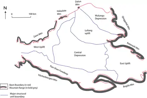 The Junggar Basin (simplified Chinese: 准噶尔盆地; traditional Chinese: 準噶爾盆地) is one of the largest sedimentary basins in Northwest China. It is located in Xinjiang,[1] and enclosed by the Tarbagatai Mountains of Kazakhstan in the northwest, the Altai Mountains of Mongolia in the northeast, and the Heavenly Mountains (Tian Shan) in the south.[1][2] The geology of Junggar Basin mainly consists of sedimentary rocks underlain by igneous and metamorphic basement rocks.[3] The basement of the basin was largely formed during the development of the Pangea supercontinent during complex tectonic events from Precambrian to late Paleozoic time.[4] The basin developed as a series of foreland basins – in other words, basins developing immediately in front of growing mountain ranges – from Permian time to the Quaternary period.[1] The basin's preserved sedimentary records show that the climate during the Mesozoic era was marked by a transition from humid to arid conditions as monsoonal climatic effects waned.[2] The Junggar basin is rich in geological resources (e.g. petroleum, coal and ore deposits) due to effects of volcanism and sedimentary deposition.[3][5]