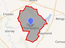 Jussy-Champagne is an area of forestry and farming, comprising the village and several hamlets situated in the valley of the river Craon, some 15 miles (24 km) southeast of Bourges, at the junction of the D19, D15 and the D367 roads.