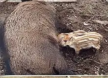 Young wild boar suckling from an adult female. Here, juvenile colouring acts as a form of camouflage.