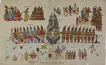Jyestha has a banner depicting a crow, and is popularly called "crow-bannered" (Kakkaikkodiyal) in Tamil. A group of two attendant goddesses sometimes stand beside her, usually carrying a crow and a broom.[7] Sometimes a crow stands next to her.[5] Jyestha is often depicted with two attendants, sometimes interpreted as her son and daughter. The man is bull-faced and holds a rope or cord. The woman is depicted as a beautiful damsel with a conical crown.[8]