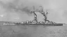 After the start of the war in July 1914, work on the vessels was accelerated so they would be available for operations as soon as possible. König and Grosser Kurfürst were completed in the first weeks of World War I; the latter had completed sea trials in time to take part in the Raid on Yarmouth on 3 November 1914, as part of the High Seas Fleet, which provided distant cover to the battlecruisers of I Scouting Group that carried out the raid. König was ready for service later that month, and both vessels participated in the raid on Scarborough, Hartlepool, and Whitby on 15–16 December, again providing distant support to the battlecruisers.[38][39] König and Grosser Kurfürst, assigned to III Battle Squadron, formed the vanguard of the German line of battle. During the operation on the morning of 16 December, the High Seas Fleet, commanded by Admiral Friedrich von Ingenohl, briefly clashed with the destroyer screen of the British 1st Battlecruiser Squadron and the 2nd Battle Squadron, which had been sent to intercept their German counterparts (as the British were able to decipher German codes thanks to a set of code books captured from the cruiser Magdeburg in August). Ingenohl, under orders from the Kaiser not to risk the fleet and fearing he had located the scouts for the entire Grand Fleet, disengaged and returned to port.[40]