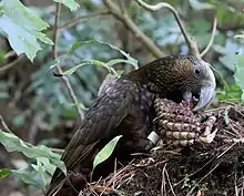 Kākā typically eat fruits, berries, seeds, flowers, buds, nectar, sap, plants and invertebrates. They use their strong beak to shred the cones of the kauri tree to obtain the seeds.[19] It has a brush tongue with which it feeds on nectar, and it uses its strong beak to dig out the grubs of the huhu beetle and to remove bark to feed on sap.[20]