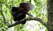 The kākā nests in cavities in hollow trees. The entrance hole is often three to six metres above the ground,[16] but can be as low as ground level on predator-free offshore islands.[17] The nest floor is lined with small wood chips[17] and powder.[16] They lay eggs any time between September (late winter) and March (summer).[16] Occasionally, in a good fruiting year, a pair can double clutch, often utilising the same nest hole for the second clutch and extending breeding into winter.[17] They typically lay four eggs,[16][17] though it can be up to eight,[18] with two chicks fledging.[16] Only the female incubates the eggs, for about 24 days,[16] and cares for the nestlings, but she is regularly fed by the male throughout breeding.[17] Both parents feed the chicks after they have fledged.[17]
