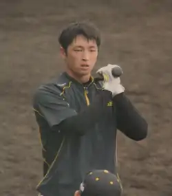 He joined the main squad during spring camp training, and showcased an impressive performance in the pre-season exhibition games where he batted 0.373 on 22 hits.[12] This earned him the lead-off and starting center field position in the March 29 season opening game against the Swallows. During the 6th inning, his first career hit tied the game and he became the first Hanshin rookie since 1956 to score in the season opener.[13] Hanshin won the game.[14] His next appearances were not so productive which got him removed from the line up, but his performance picked up after he hit his first home run against the Baystars on April 11.[15] From then on, he continued to secure the lead-off spot and went on a hitting spree for 13 consecutive games which broke the team rookie record.[16] In the same month, he batted an average of 0.349 and set a new record for the most home runs hit by a rookie in a single month (4).[17]