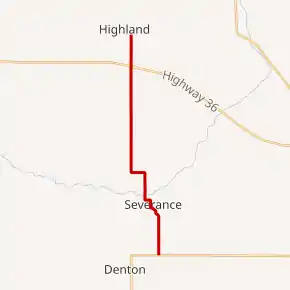 K-120 is a 9.126-mile-long (14.687 km) north–south state highway in the U.S. state of Kansas. K-120's southern terminus is at K-20 south of the City of Severance and the northern terminus is a continuation as Kansas Street at the Highland city limits.[3] Just south of its northern terminus it intersects U.S. Route 36 (US-36).