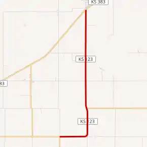 In 1927, the highway that became K-123 was established as K-23.[12] Then between July 1938 and 1940, US-183 was realigned to go east from Oberlin along US-36. At this time K-23 was realigned to follow K-9 west to US-83, then north to US-36 and US-183 in Oberlin and K-123 was created to replace the former alignment of K-23 from K-9 to Dresden.[2][3] Between 1941 and 1944, US-183 and US-83 were swapped within Nebraska and a small portion into Kansas. At this time K-23 was truncated to its present-day northern terminus at US-83 and K-9 was truncated to end at K-23.[13][14] Between 1944 and 1945, K-9 was realigned to end at US-83 in Dresden.[14][15] In a December 20, 1950 resolution, it was approved to realign K-9 to start at K-123 south of Dresden.[16] Then between 1953 and 1956, construction had finished and K-9 was realigned to start at K-123 south of Dresden.[17][18] On April 1, 1981, K-123's northern terminus was renumbered from US-383 to K-383.[19]
