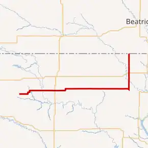 K-148 is an 86.665-mile-long (139.474 km) state highway in the U.S. state of Kansas. K-148's western terminus is at K-28 north of Randall and the northern terminus is a continuation as Nebraska Highway 112 at the Nebraska state line. K-148 is signed as east–west its entire length although the last roughly 20 miles (32 km) runs north–south. Along the way K-148 intersects several major highways including U.S. Route 81 (US-81) east of Norway and US-36 south of Hanover. The highway travels through mostly rural land and small unincorporated communities, however it does pass through the cities of Agenda and Barnes.