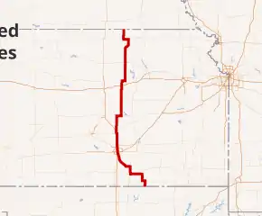 K-15 is a 257.141-mile-long (413.828 km) north–south state highway in the U.S. State of Kansas. Originating at the Oklahoma state line as a continuation of State Highway 18 and continuing to the Nebraska state line where it continues as Nebraska Highway 15. Throughout Kansas, it is signed as the Eisenhower Memorial Highway due to its route through Abilene, where the Eisenhower Memorial Museum and Library is located.[2][3]